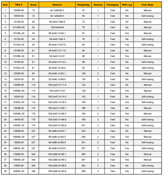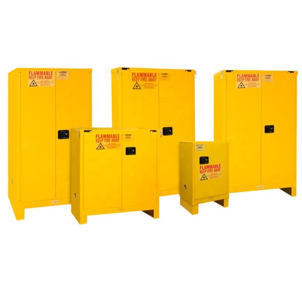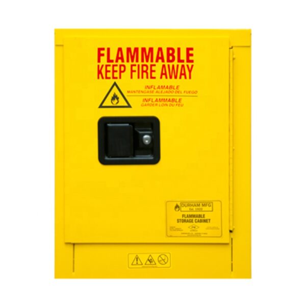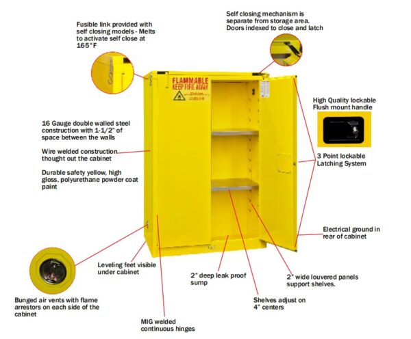 Gabinete de seguridad TWK con certificación NFPA30, OSHA 1910.106 y FM. El gabinete tiene una construcción de acero de doble pared calibre 16 con 1-1/2” de espacio entre las paredes. La pintura en polvo de poliuretano de alto brillo y color amarillo de seguridad prolonga la durabilidad del producto y la conexión a tierra eléctrica en la parte inferior derecha ayuda a eliminar una descarga electrostática. Todas estas características garantizan el almacenamiento seguro de productos químicos peligrosos y reducen el riesgo de incendio.